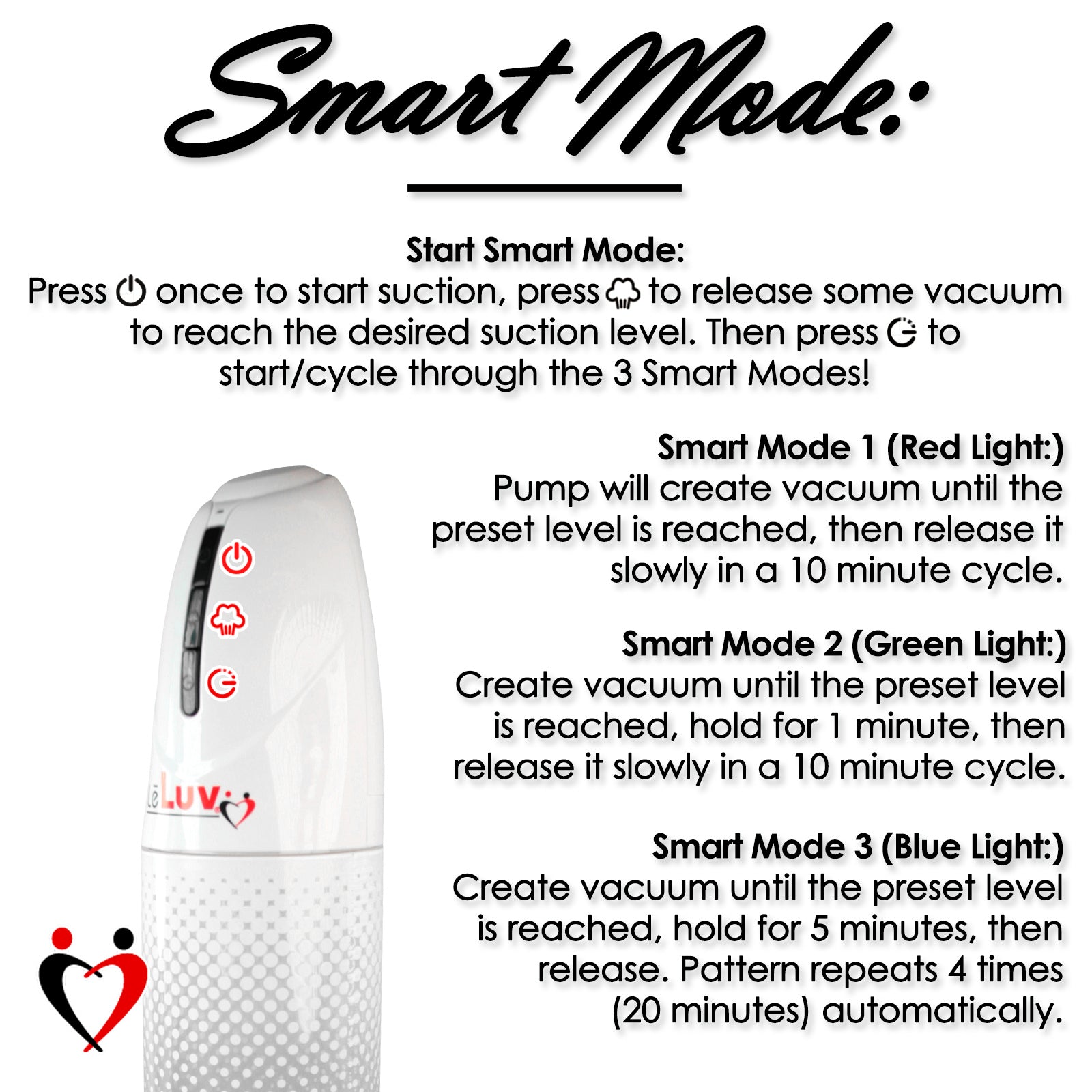This LeLuv® Smart iPump® Penis Vacuum Pump can be operated in a Manual Mode or Smart Mode that will enable you to record the desired vacuum level you want, and then utilize that recorded vacuum level for a short, medium or long duration by selecting one of the three Smart Cycles. The cylinder has both imperial and metric measurements manufactured directly into the cylinder walls. The Smart iPump®'s operation is very quiet, is rechargeable via a USB cable, and is easy to disassemble for cleaning of the cylinder and sleeves. Always clean with an antibacterial soap or toy cleaner before and after each use. Never immerse the head in water and do not use silicone lubricants.